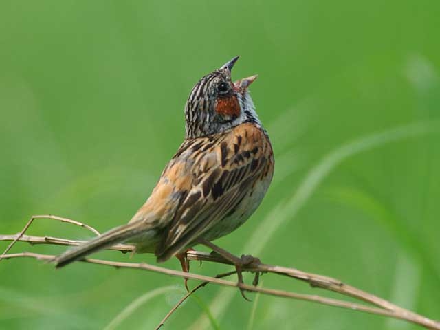 草原の少し高くなったソングポストで唄うホオアカです。