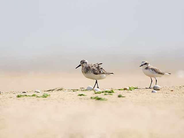 長い渚の砂浜には沢山のミユビシギとシロチドリが群れていました。