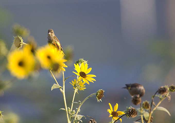 畑の端に植えられたミニヒマワリでしょうか、実ったばかりの種を早速ついばんでいました。