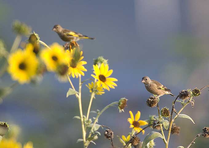 畑の端に植えられたミニヒマワリでしょうか、実ったばかりの種を早速ついばんでいました。