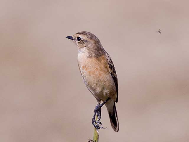 折れた茎の先端に止まっているノビタキの後ろに小さな蜂か羽蟻が飛んでいます。
