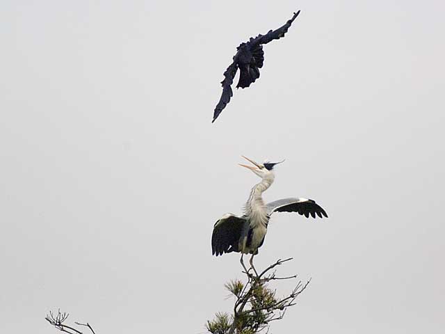 カモを撮影していると、御陵の松の先端で休んでいたアオサギにカラスがモビングを始めました。