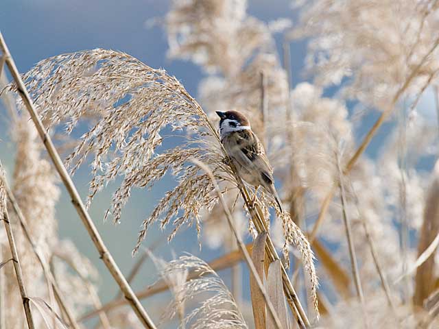 スズメもしばしば群れでやって来て葦原を賑わせます。
