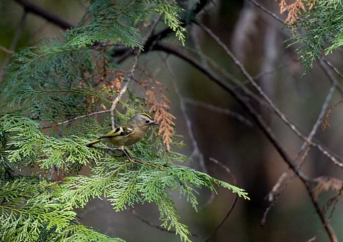 暗いヒノキの林の中をエナガの群れに遅れながら餌を探していました。