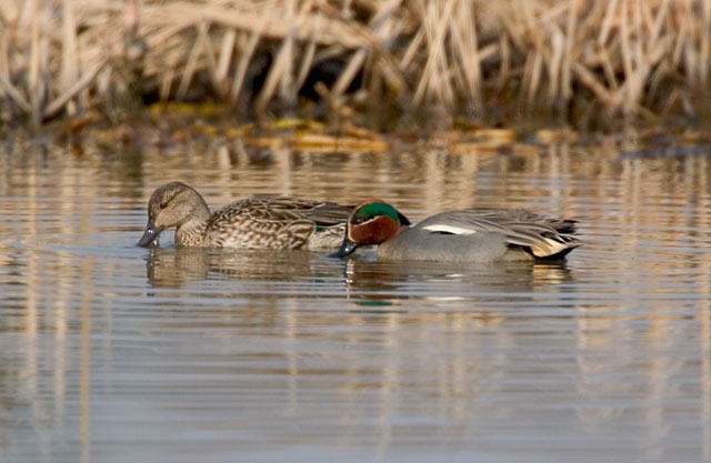平城宮跡の芦原のなかの湿地帯には水たまりがあり、コガモが餌を探しています。