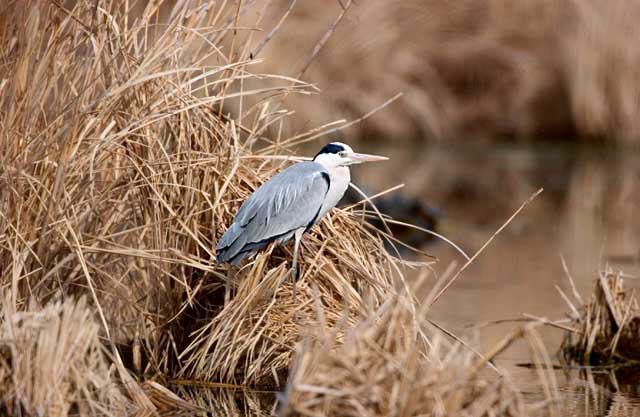 平城宮跡の芦原のなかの池のアオサギです。