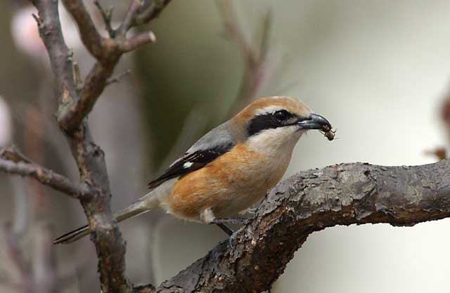 梅の下の地面に下りて虫をキャッチするとすぐに梅の木に上がり、虫を枝にこすりつけて抵抗力を奪ってから飲み込んでいました。