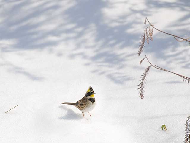 今日は朝から晴れて気温も上がって木々の上から湿った雪が頭の上に落ちて来るなかでの撮影です。