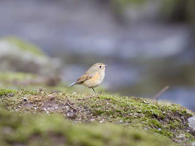 脇のオレンジ色も薄く肩羽に青みがなく、雌のルリビタキです。