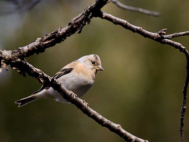 暗い林の中で出会った雌のアトリです。