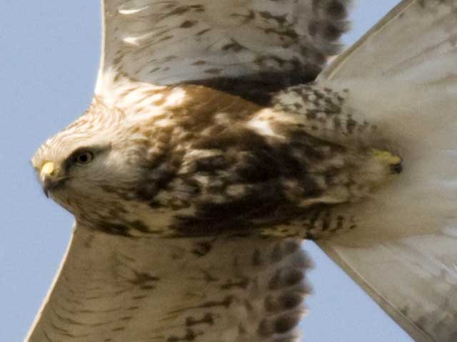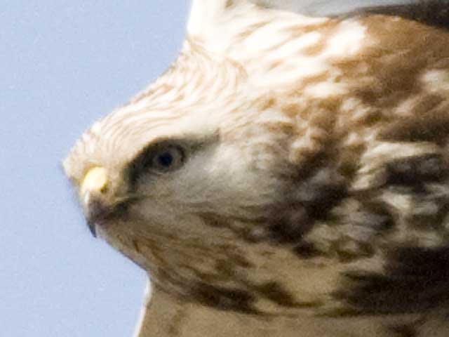 2008.2.25 ケアシノスリ 掲載の翌日に気になって別ファイルを拡大して見ましたところ、さらに二つの特徴を知ることができました。 1.ノスリの目と違って、ケアシノスリ独特の黄色の虹彩である。 2.胴体の最後端に黄色のあしゆびが見えており、これは白い羽毛で包まれている。 なおこの画像はピクセル等倍までの拡大で、アンシャープ処理なしの画像です。 |