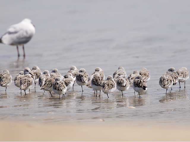 穏やかな春の渚に、ミユビシギが群れていました。