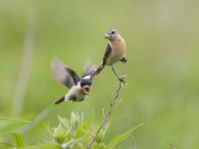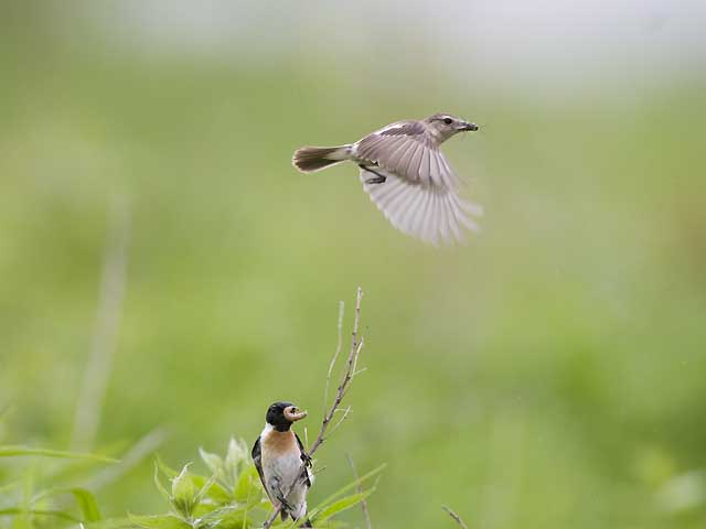 雌が餌をくわえて停まっているところに雄も餌をくわえて帰ってきたようです。