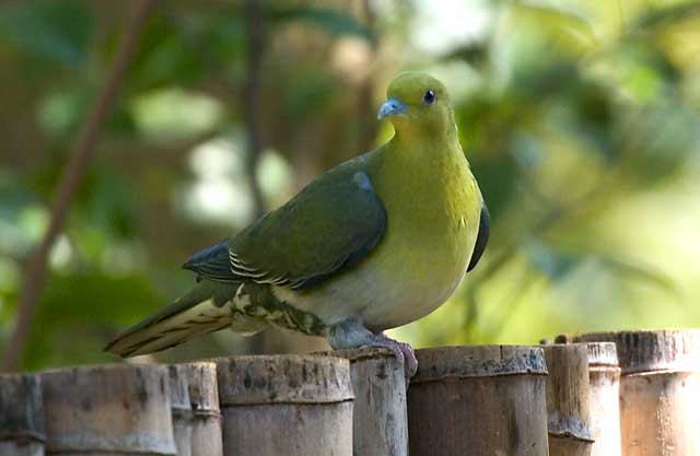 樫の木の梢から竹の塀に下りてきたアオバトの雌です。