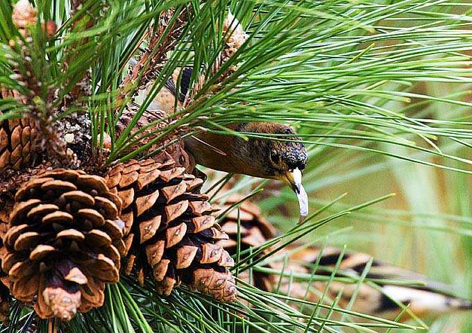 高い松の木の上ではアトリの群が食事に余念がありません。
