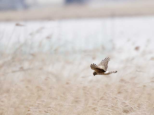 西の湖近くの葦原の上を飛ぶハイイロチュウヒ♀です。