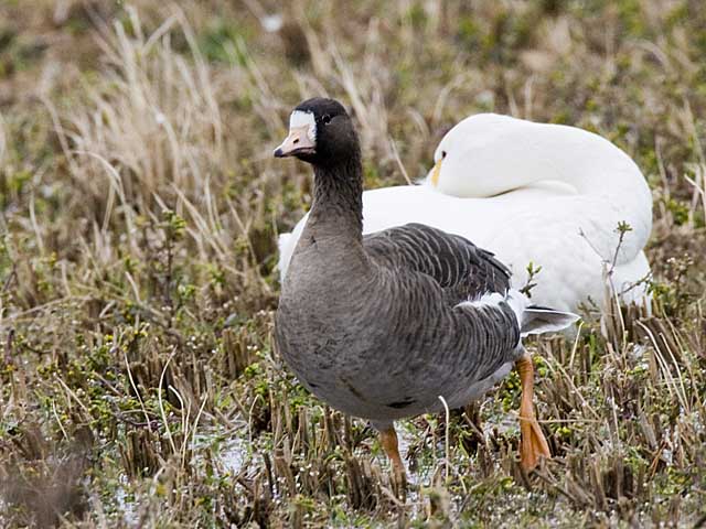 初めは小型で、おでこに見えてカリガネかと思いましたがアイリングが無いところをみると、やはりマガンでしょう。