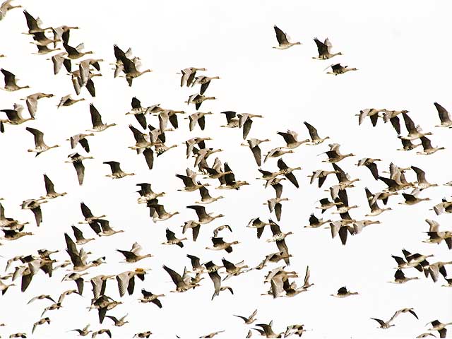 宍道湖近くの田園の上空を飛ぶマガンの群です。