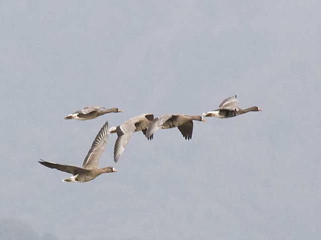 宍道湖近くの田園の上空を飛ぶマガンの群れです。