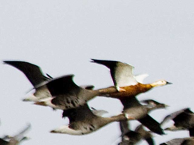 雁の群れのなかで飛翔するハクガンです。