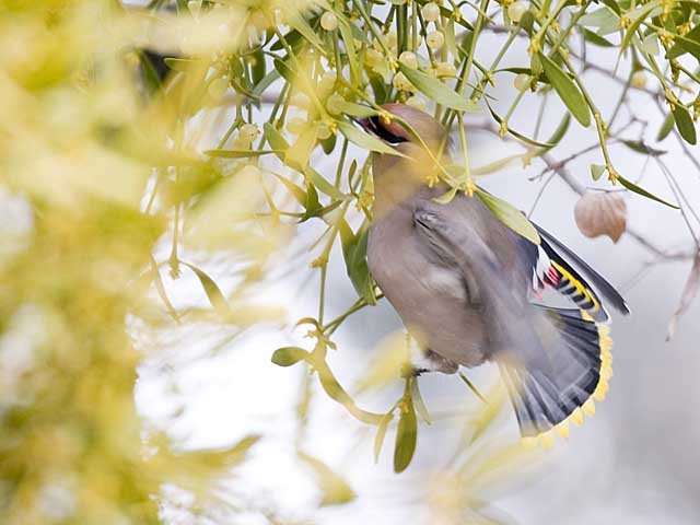 飛びながらヤドリギの実をもぎ取っているようです。