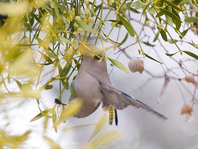 飛びながらヤドリギの実をもぎ取っているようです。