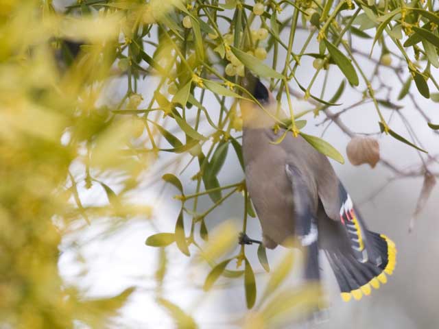 飛びながらヤドリギの実をもぎ取っているようです。
