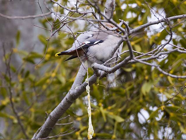 よく知られているようにヤドリギの実には粘り気があり、レンジャクの糞もよく粘ってヤドリギの種を木に粘着させることでヤドリギの繁殖を助けています。