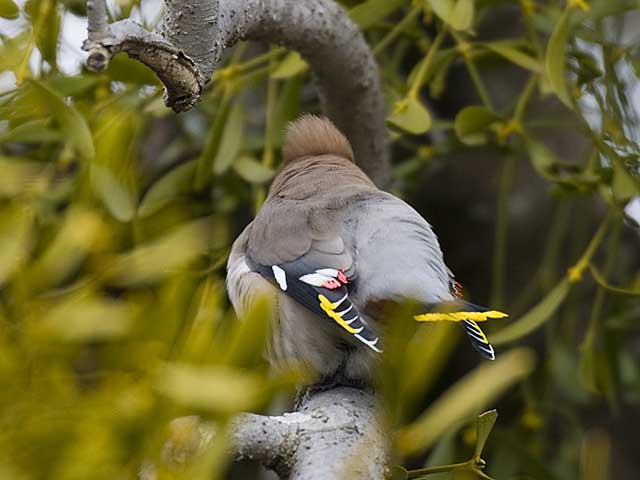 ヤドリギの種を食べている後ろ姿ですが風切羽や尾羽の先の黄色い彩りがきれいでした。
