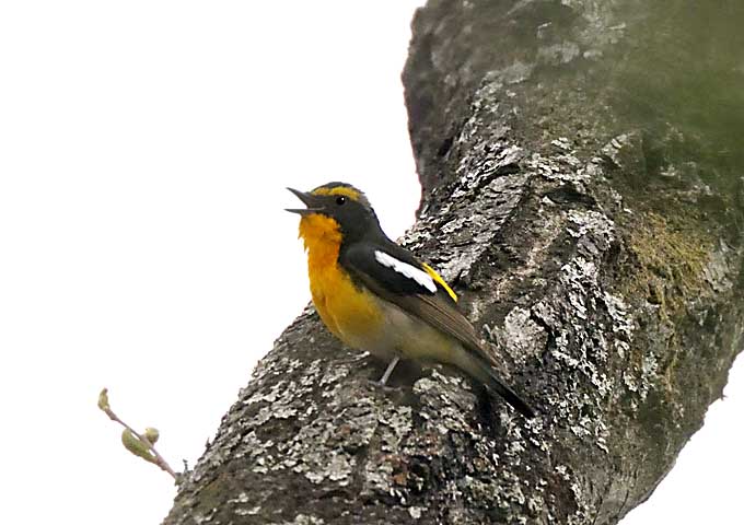 芽吹き始めた太い木の枝で唄うキビタキです。