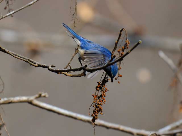 羽根でバランスを取りながらフラ下がって実をついばみます。