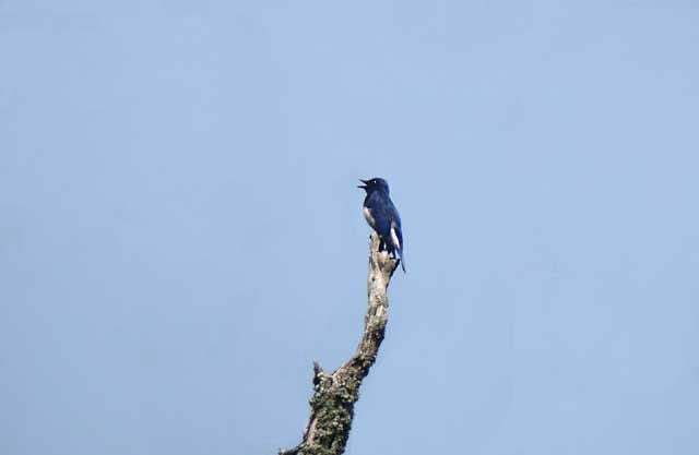 高い樅の木の頂上で啼いている小さなオオルリですが、楽しかった探鳥会の記念のデジスコ写真です。
