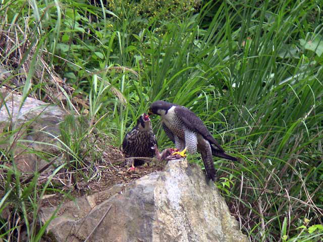 j自分の食事が終わると、巣立った雛のところにやって来て餌をちぎっては口移しに与えています。