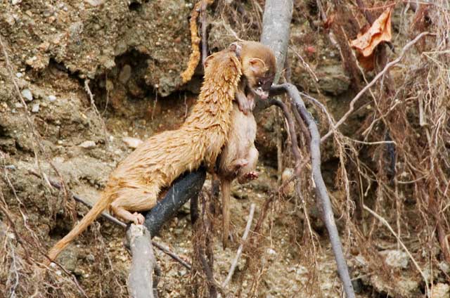 巣穴から出て遊んでいた子ども達(2匹)を順番にくわえて巣穴の中に連れてゆくところです。