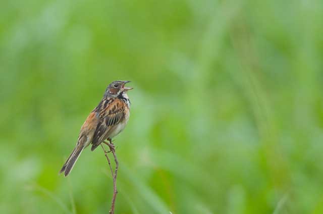 朝の爽やかな草原にホオアカの歌声が響いていました。