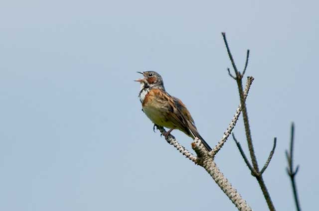 朝の爽やかな草原にホオアカの歌声が響いていました。
