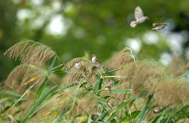 平城宮跡の芦原にスズメの若鳥たちが群れて飛び回っていました。