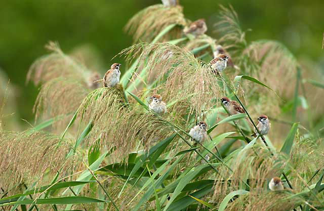 平城宮跡の芦原にスズメの若鳥たちが群れて飛び回っていました。