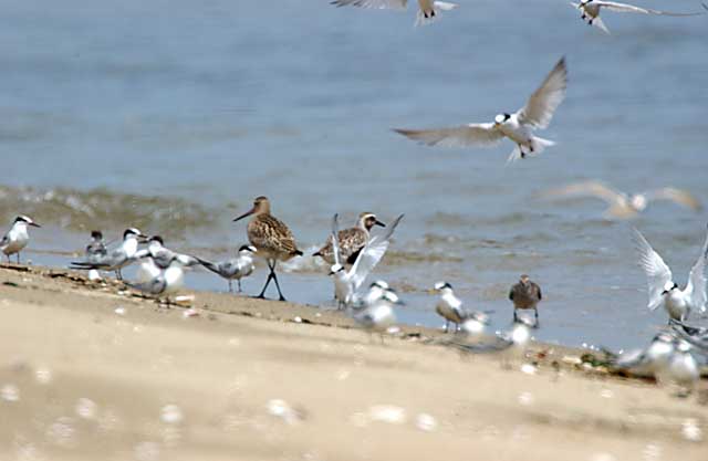 ダイゼン、オオソリハシシギの上を舞っているのはコアジサシです。