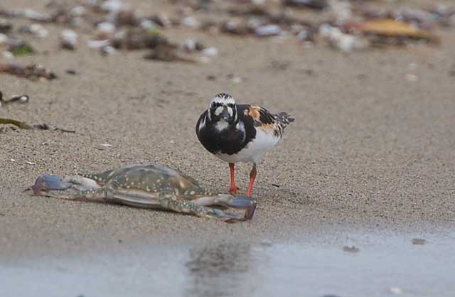 波打ち際に打ち上げられた新鮮なカニの死骸を熱心に食べているキョウジョシギに別の場所でもであいました。
