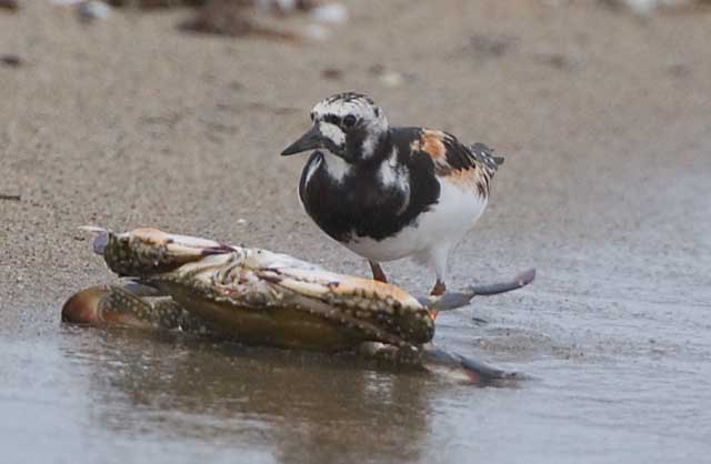 波打ち際に打ち上げられた新鮮なかにの死骸を熱心に食べているキョウジョシギに別の場所でもであいました。
