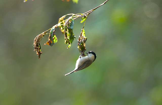 最初に、ヤマハンノキの葉につく虫を食べているコガラに出会いました。