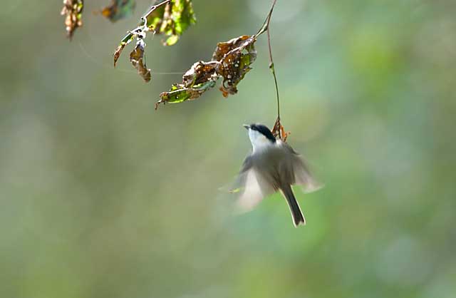 最初に、ヤマハンノキの葉につく虫を食べているコガラに出会いました。