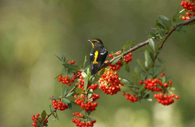 公園の中にピラカンサの枝で飾った餌台をセットして鳥を待っている方がいました。
