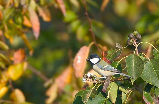 紅葉の始まったナンキンハゼの実を食べるシジュウカラです。