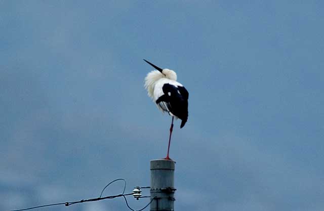しばらく飛んだ後に電柱の上で一休みして羽繕いです。