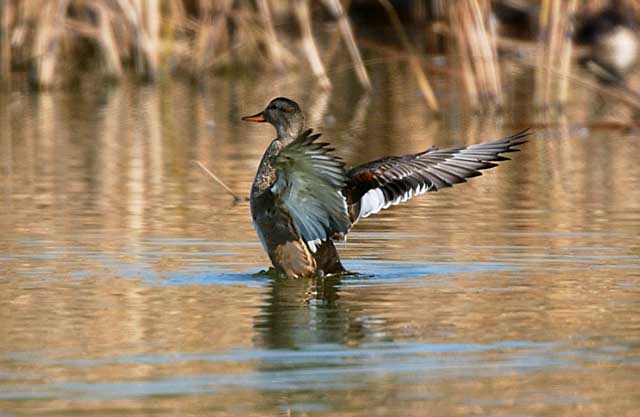 最後の水切りの羽ばたきで、3列風切り羽の白帯が見えてやはり、オカヨシガモの雌であることがはっきりしました。