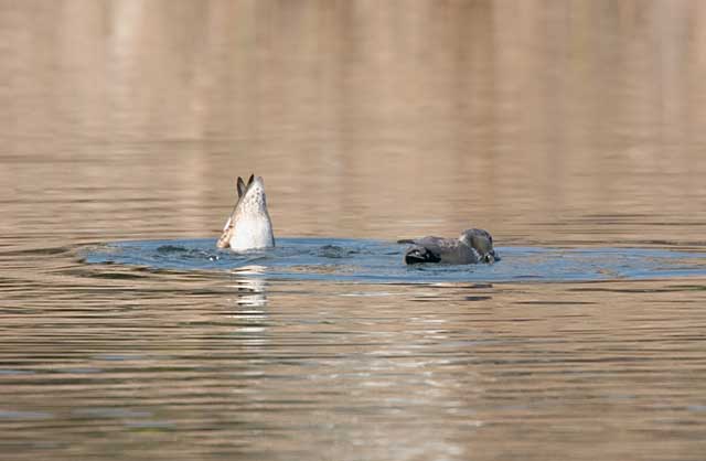 浅い池のようで、逆さまになってお尻を出してもぐっては水草を探しています。