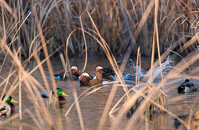日没15分前の水上池の芦の中ではオシドリの雄たちがしぶきを上げて追いつ追われつを繰り返して勢力争いをしているようです。