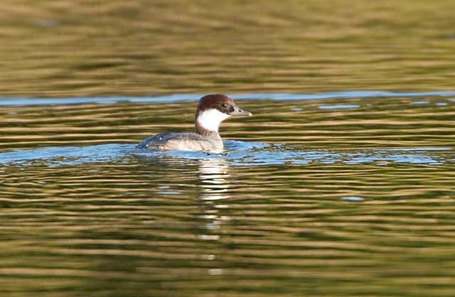 日没寸前で金色に染まった水面で出たり潜ったりしているミコアイサです。